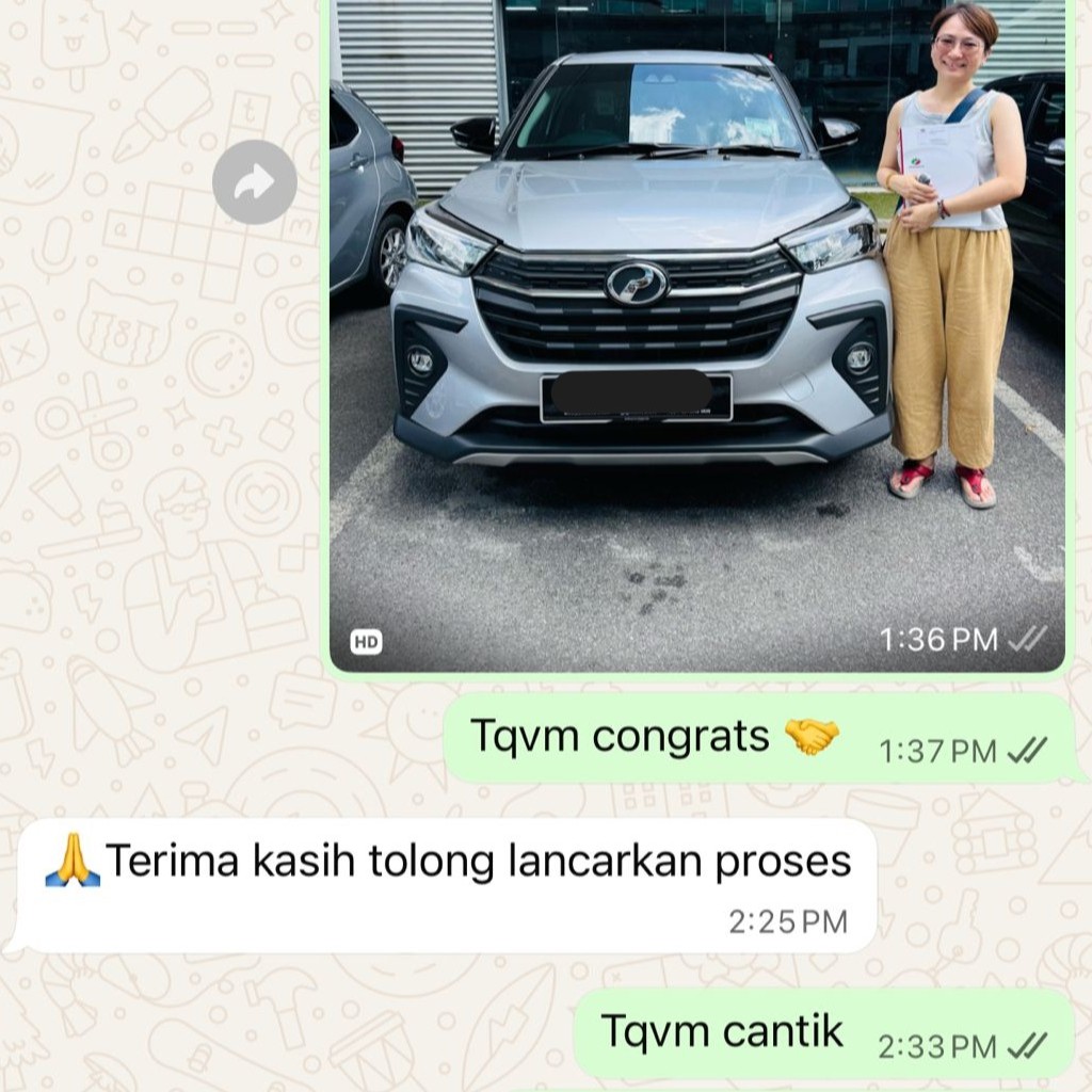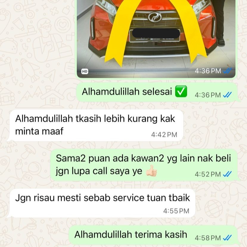 To date, I have successfully helped thousand of customers own a new Perodua car. I will fully assist you throughout the entire process from choosing a car, applying for a loan, to the delivery of the vehicle!